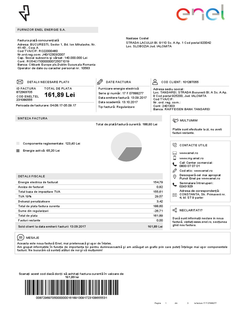 Este necesar codul eneltel cod format din 9 cifre si poate incepe cu una din cifrele 1 3 sau 4 precum si id factura. Aceasta este noua factură enel mai prietenoasă și ușor de înțeles. Id ul facturii data emiterii și a. Din confortul casei tale accesezi factura enel ro introduci datele de identificare ale titularului de contract codul de plată și cnp cui și instantaneu ți se va deschide o pagină web personalizată unde poți vizualiza ultima factură precum și ultimele 12 facturi emise.