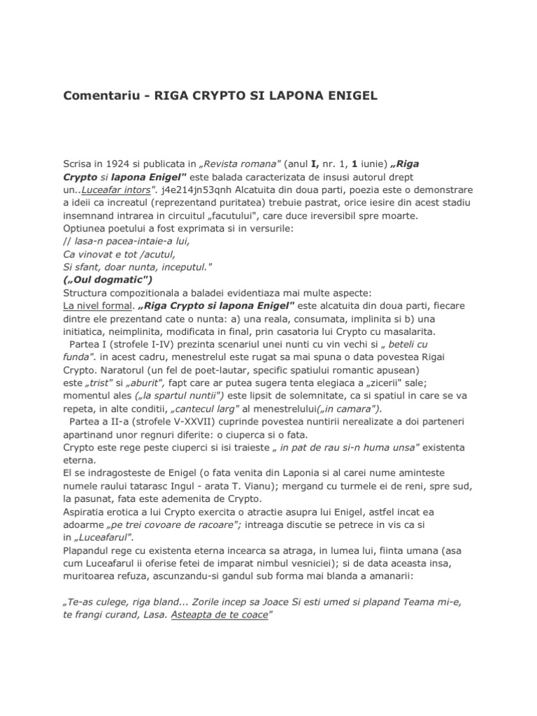 Riga crypto si lapona enigel rezumat. Subtema este reprezentata de iubire povestirea cadru surprinzand o iubire implinita iar povestirea pr zisa o iubire imposibila ce are ca tinta depasirea conditiei. Riga crypto şi lapona enigel este un poem alegoric publicat de ion barbu în perioada interbelică. Riga crypto si lapona enigel menestrel trist mai aburit ca vinul vechi ciocnit la nuntă de cuscrul mare dăruit cu pungi panglici beteli cu funtă mult îndărătnic menestrel un cântec larg tot mai încearcă zi mi de lapona enigel şi crypto regele ciupearcă. Una din cele mai semnificative creatii ale lui ion barbu in sfera ciclului baladesc demonstratie lirica incarcata de semnificatii este balada riga crypto si lapona enigel.