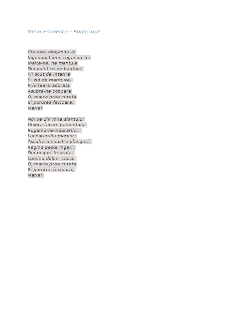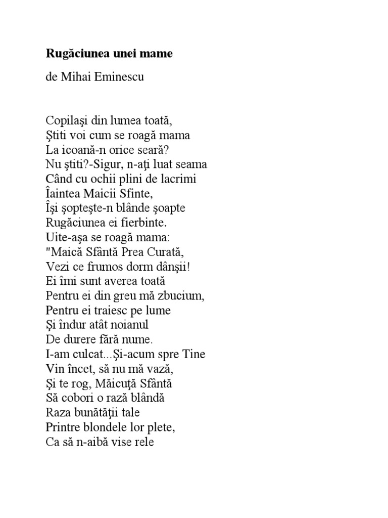 Rugaciune de mihai eminescu. Rugaciune de mihai eminescu. Rugaciune mihai eminescu. Fii scut de intarire si zid de mantuire privirea ti adorata asupra ne coboara o maica prea curata si pururea fecioara marie. Din neguri te arată lumină dulce clară.