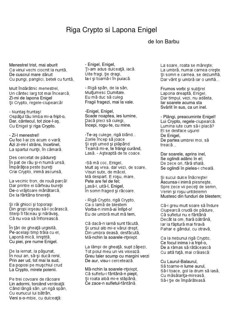 Cu foc l ai zis acum o vară. Scris de cristina stancu 15 april 2013 in categoria recenzii pentru bac. Riga crypto si lapona enigel menestrel trist mai aburit ca vinul vechi ciocnit la nuntă de cuscrul mare dăruit cu pungi panglici beteli cu funtă mult îndărătnic menestrel un cântec larg tot mai încearcă zi mi de lapona enigel şi crypto regele ciupearcă. Pe trei covoare de răcoare lin adormi torcând verdeaţă.