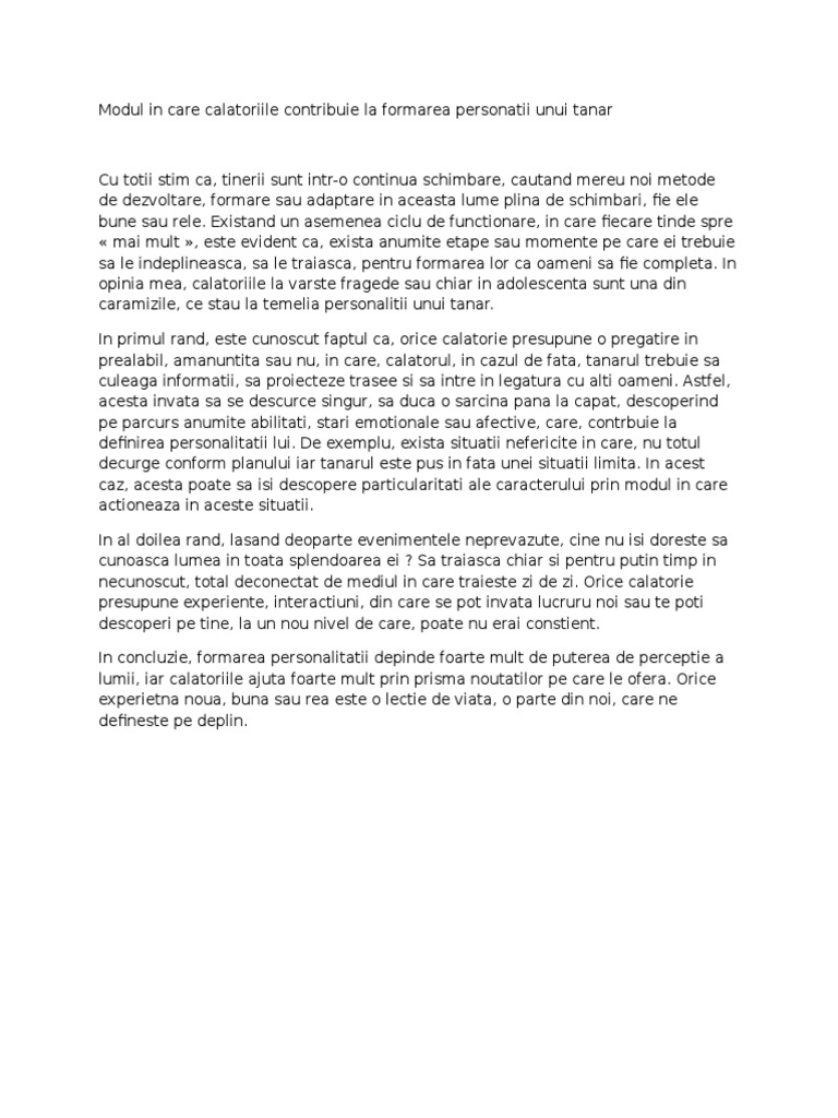 Majoritatea călătoriilor influenţează personalitatea omului pozitiv îl ajută să vadă lumea dacă este bună sau rea şi să îşi creeze o părere. Textul argumentativ despre importanța călătoriilor în formarea personalității tinerilor este un model de rezolvare corectă și completă a cerinței de la simularea examenului de bacalaureat din anul 2014 primită de elevii clasei a xii a de la profilul real. Ce credeti despre importanta calatoriilor in formarea personalitatii omului. O definire o prezentare generală a temei puse în discuție b.